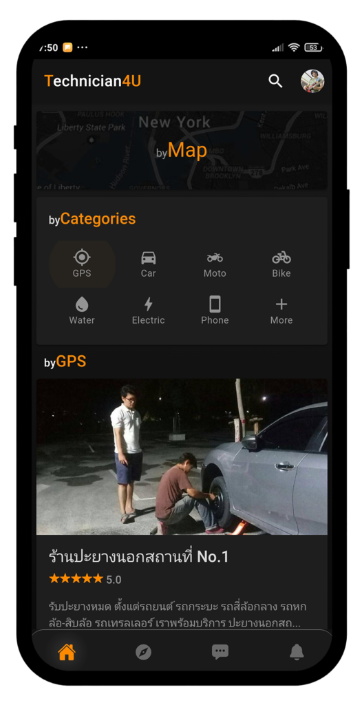 - ไม่ว่าจะอยู่ที่ไหน ต่างจังหวัด สถานที่ไม่คุ้นเคย ต้องการความช่วยเหลือ ก็สามารถหาช่างได้จาก ตำแหน่งโทรศัพท์ GPS หรือ แผนที่